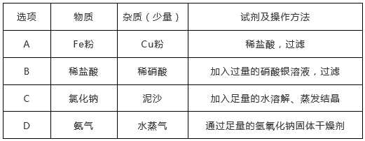 D、氢氧化钠固体具有吸水性,且不与氨气反应,能除去杂质且没有引入新的杂质,符合除杂原则,故选项所采取的方法正确。