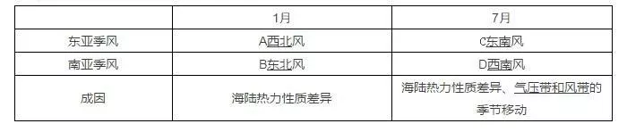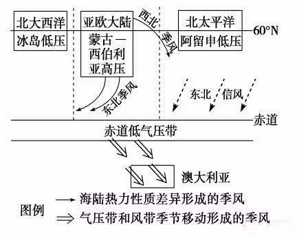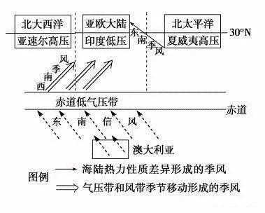 提醒:在赤道南北两侧的地区都会有气压带和风带季节移动形成的季风现象。如非洲索马里半岛、几内亚湾沿岸等。
