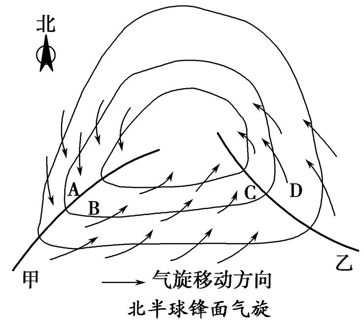 (3) 天气:两个锋面附近气流上升强烈,往往产生云、雨、雪,甚至造成雷雨、暴雨、暴雪、大风降温等天气。甲锋面附近的降雨主要在A处,而乙锋面附近的降水主要在D处。
