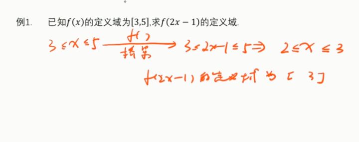例题1、已知f(x)的定义域为[3,5],求f(2x-1)的定义域。(解题过程答案如图)