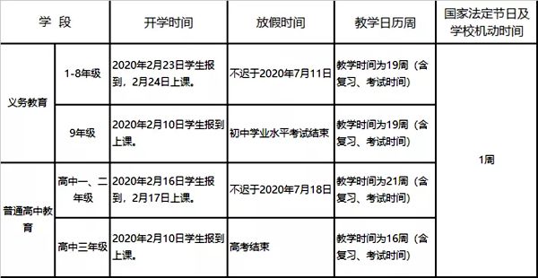义务教育阶段学校寒假从2020年1月13日 (农历腊月十九)至2月9日(农历正月十六),2月10日(农历正月十七)正式上课;普通高中学校寒假从2020年1月17日(农历腊月二十三)至2月9日(农历正月十六),2月10日(农历正月十七)正式上课。未经主管教育行政部门同意,任何学校不准提前或延后放假时间,确遇特殊情况需要调整放假时间的,须报主管教育行政部门批准,并向学生家长说明原因,向社会公示。幼儿园在不影响幼儿家长工作的前提下,可妥善安排寒假期间教职工的休息时间。