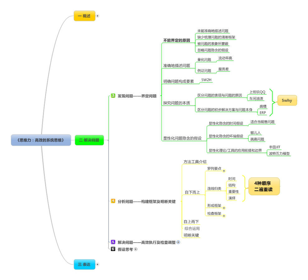 下面我就以如何阅读《思维力:高效的系统思维》为例,演示下这种阅读方法的高效性。多重阅读总共四个步骤:步骤一明确阅读目的这个步骤跟整体阅读的步骤1完全一样,要求你带着明确的目的开始阅读。这样既能选出合适的书籍阅读,又能保证阅读时的高效性。如果你对阅读的题材之前有基础的话,还可以在阅读之前先思考下:如果是我写这本书的话,我会怎么组织观点呢?比如,在开始阅读《思维力:高效的系统思维》之前,你就可以先不翻开书,而是设想下,从你的阅读目的出发的话,你会怎么编排目录?是按照解决问题的思考步骤来组织呢,还是按照一个个思考工具来组织呢,或者按照不同的问题类型来组织呢?经过这一步思考,你再翻开《思维力:高效的系统思维》这本书的话,跟你什么都不想就直接翻开书相比,阅读的主动性、理解的程度立马就会得到大大加强。步骤二画出阅读导图确定好阅读目的,自己做过初步思考后,你就可以浏览下书的封面、腰封(如果有的话)、作者简介、目录、序言等等。做这一步的目的有两个:①让大脑对本书内容形成一个整体印象,这样阅读起来记忆和理解的效果会更好些;