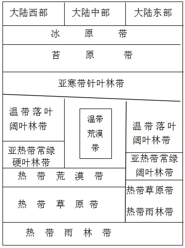 1. 陆地自然带:陆地上不同地区,因纬度位置、海陆位置不同,水热组合不同,形成不同的气候类型,又形成与之对应的植被和土壤类型。相应的气候、植被和土壤共同形成了具有一定宽度、呈带状分布的陆地自然带。