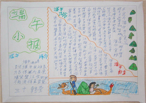 今天是端午节,家家户户都热热闹闹的。每当到了端午节,人们都要吃粽子、赛龙舟、喝雄黄酒,挂上艾草、香袋和在孩子的身上写“王”字。我在网上查了一下。原来这是为了纪念伟大的爱国诗人屈原的。公元前278年,秦军攻破楚国都城,屈原和一位楚国大夫知道消息后,悲愤交加、心如刀割。最后,他们抱着一块大石头跳江了。当地的老百姓知道后,就往里面扔粽子,希望鱼儿不吃屈原的身体,只吃他们扔的粽子。