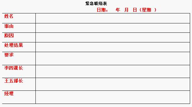 表二反映是处理紧急事件,课长下班了,自己把这个带着红字的表格填好后,放入公司最显眼的一个紧急联络筐里,然后自己就可以下班了,第二天上班时,课长会拿着紧急联络表去向上司反映,其实用紧急联络表的形式处理紧急事务,避免了遗忘,紧急联络表一旦进了筐,各部门的主管都可以看,与自己有关的,会尽快做好处理的准备。